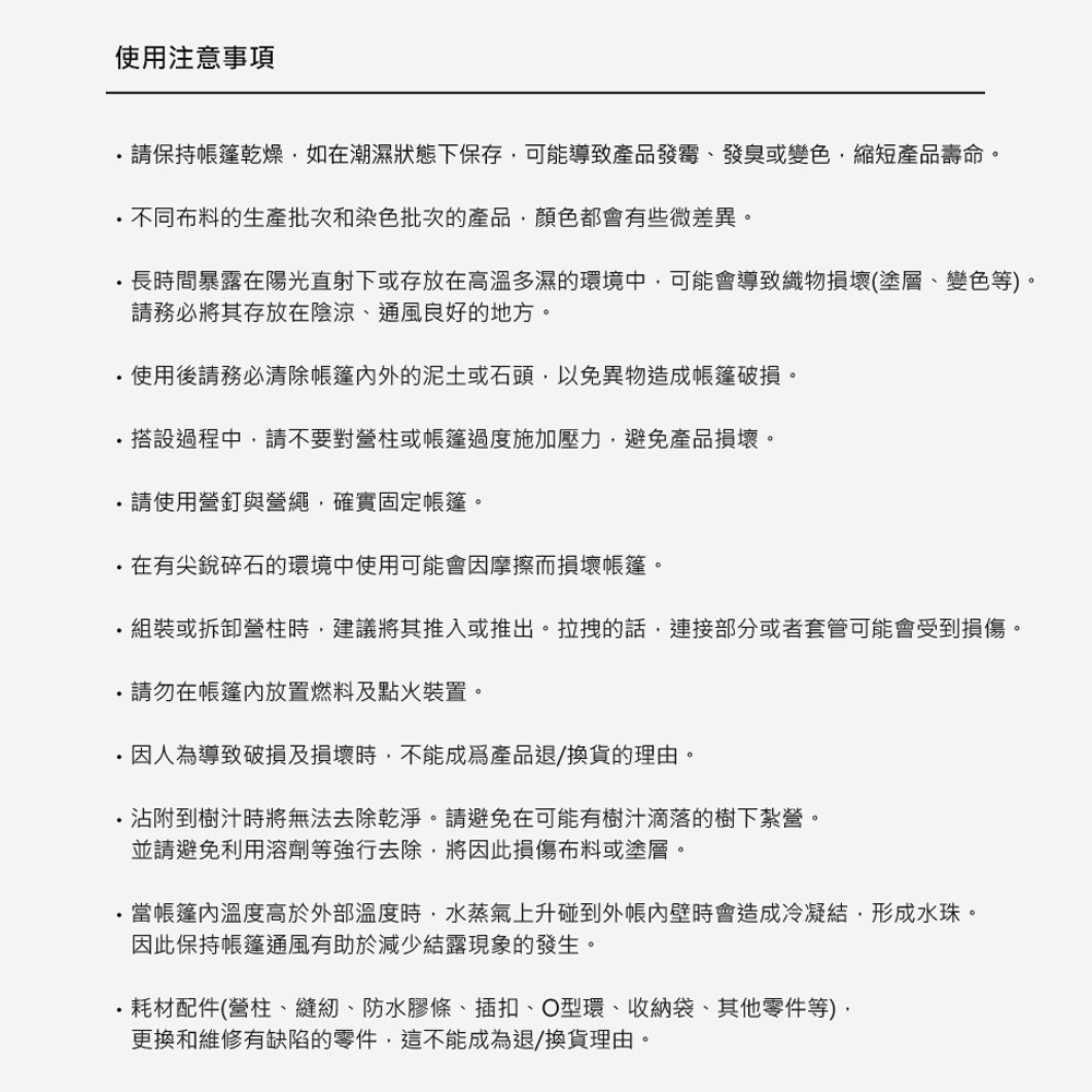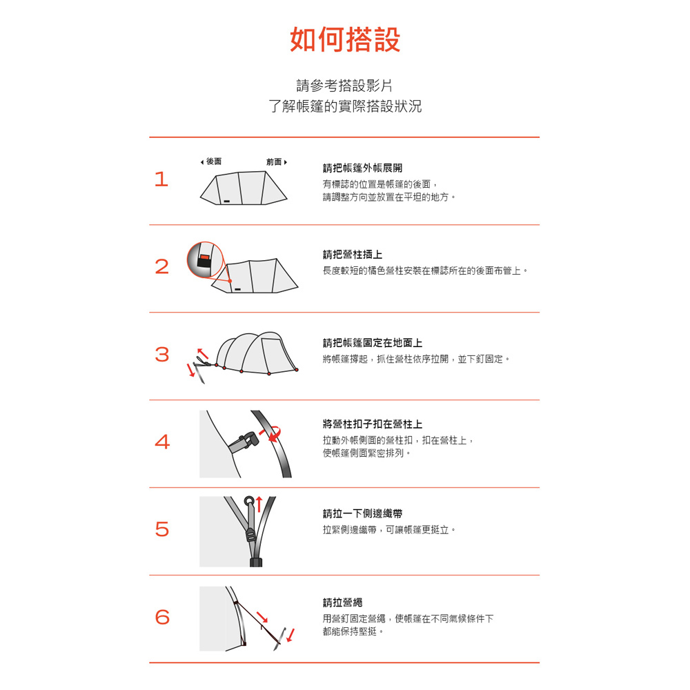 內容物:外帳 / 內帳 / 地布 / 營柱x3 / 營釘x20 / 收納袋 / 機車固定帶x4 / 維修營柱x1