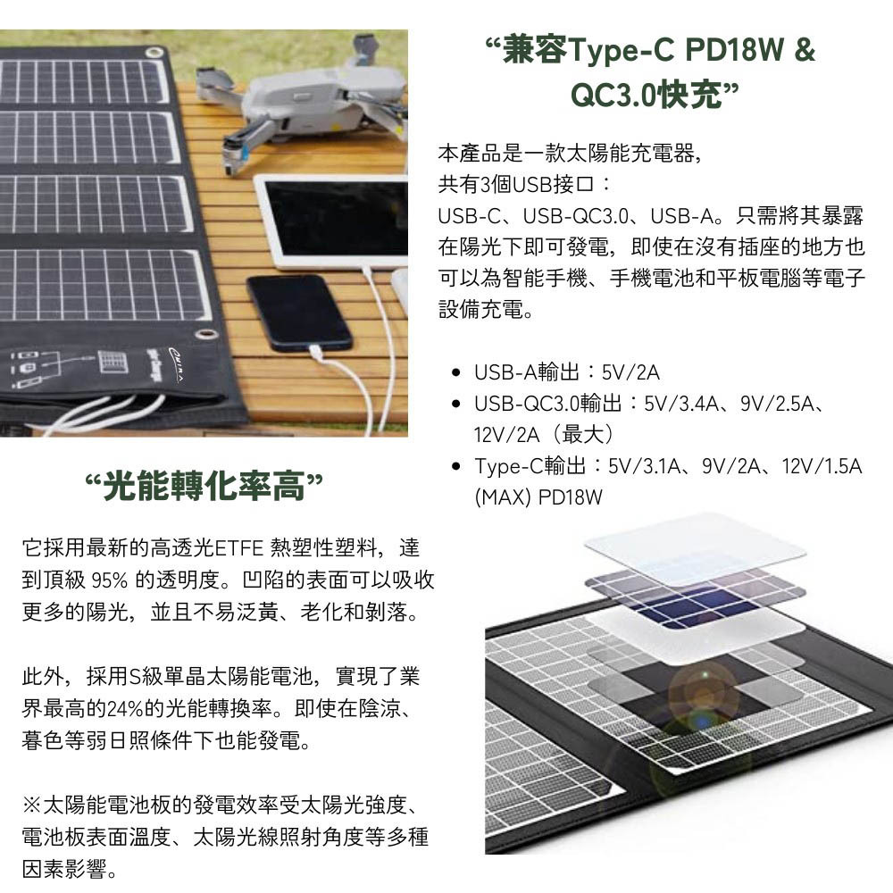 ※太陽能板充電效率與陽光照度有關(非陽光熱度),光照度越強,充電效率越好,也跟充電線有關,若充電線本身不支援快充(QC3.0、PD等等),充電效率就會受影響。