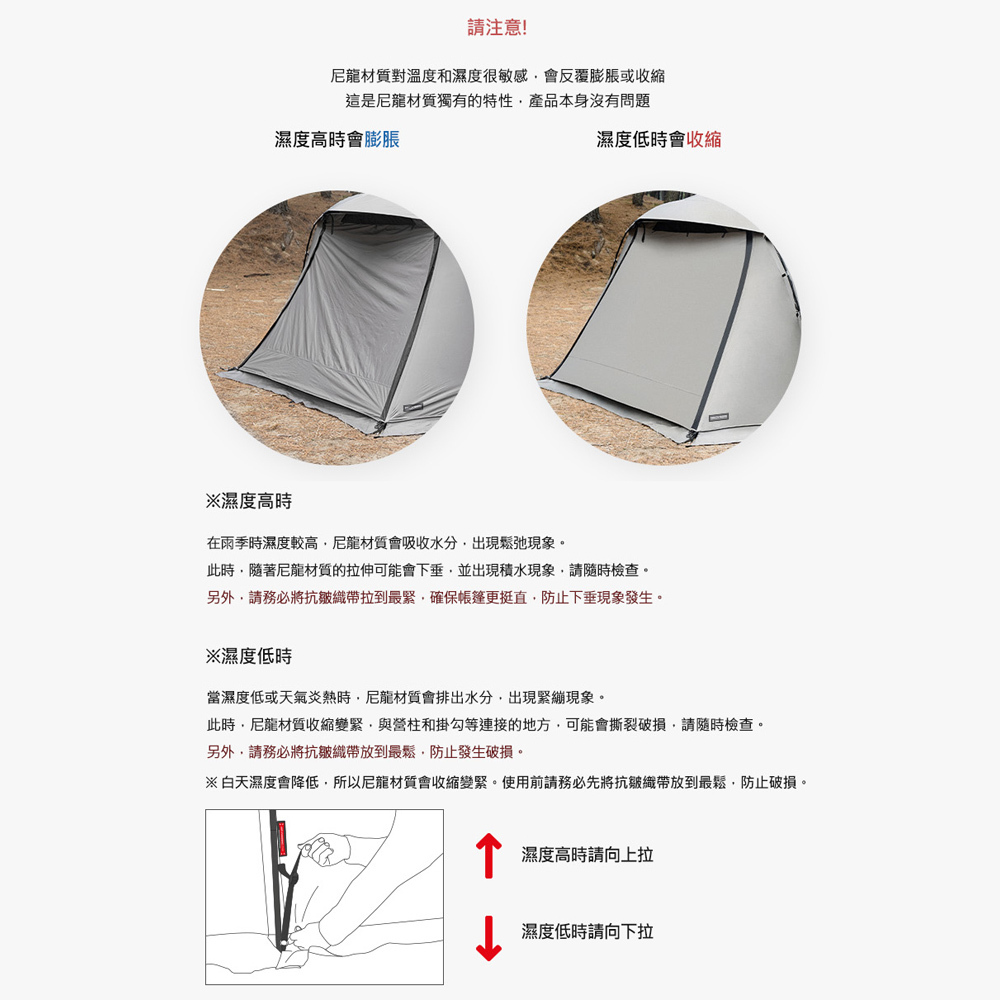 ★尼龍材質對溫度和濕度很敏感,會反覆膨脹或收縮,這是尼龍材質獨有的特性,產品本身沒有問題(濕度高時請往上拉 / 濕度低時請往下拉)。