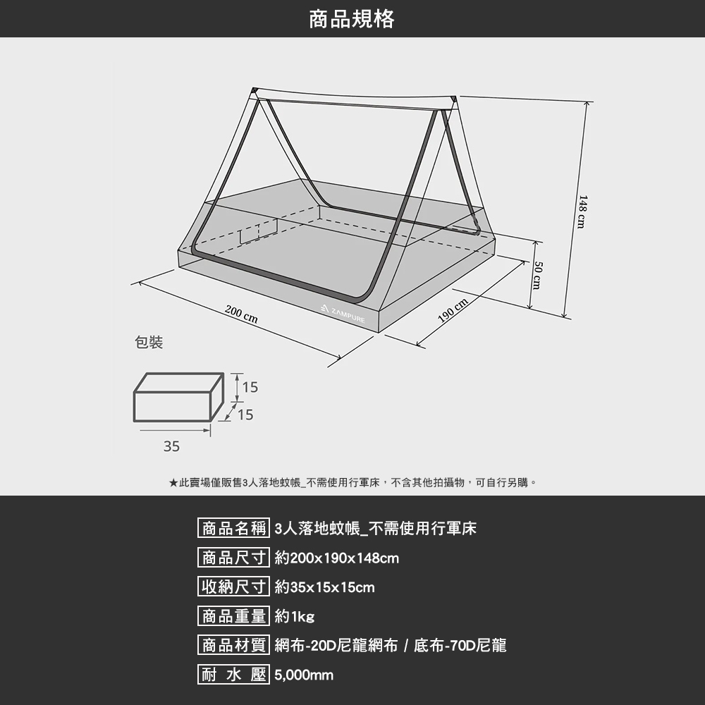 ★此賣場僅販售ZAMPURE 雙行軍床帳篷 大套組,不含其他拍攝物,可自行另購。