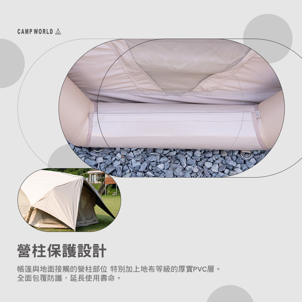 帳篷與地面接觸的營柱部位 特別加上地布等級的厚實PVC層。