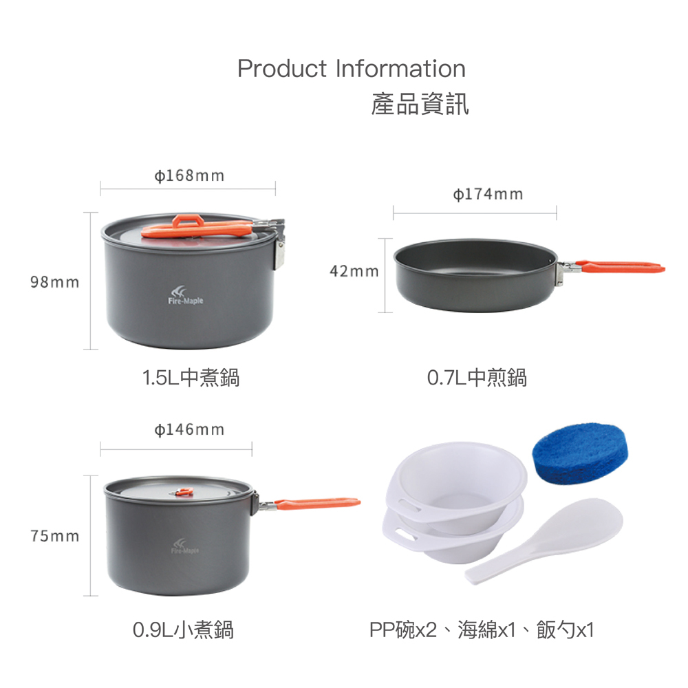 內容物:中煮鍋x1、中煎鍋x1、小煮鍋x1、飯勺x1、海棉x1、PP碗x2