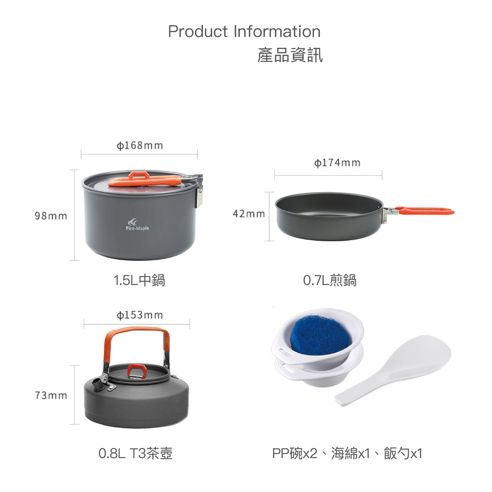 內容物:中煮鍋x1、中煎鍋x1、茶壺x1、飯勺x1、海棉x1、PP碗x2