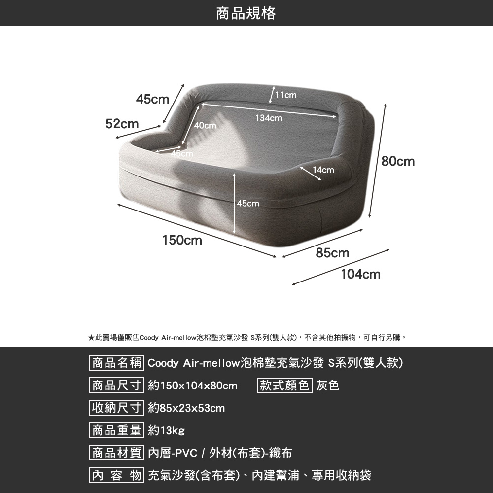 內容物:充氣沙發(含布套)、內建幫浦、專用收納袋