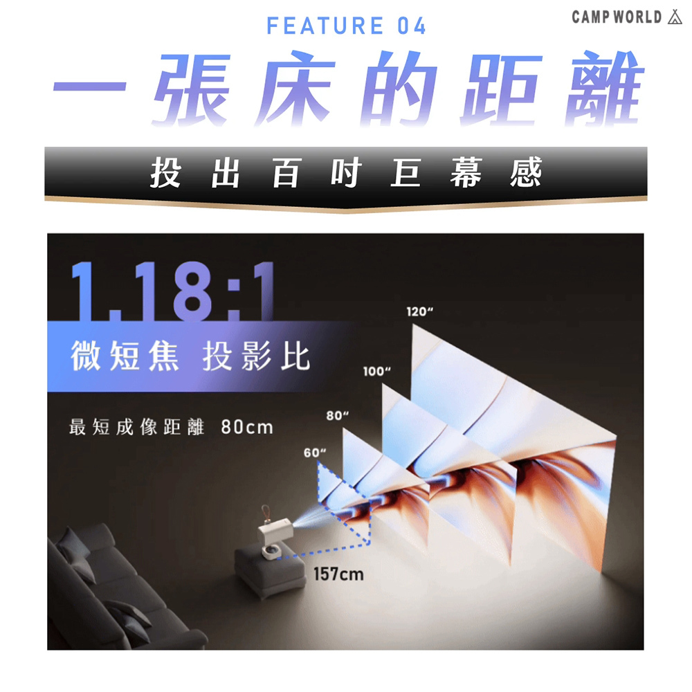 .1.18微短焦投影,與傳統投影機需一定距離才能成像相比,僅需80公分就能投影30吋畫面,再也不必擔心空間狹小,最大投射120吋巨幕。