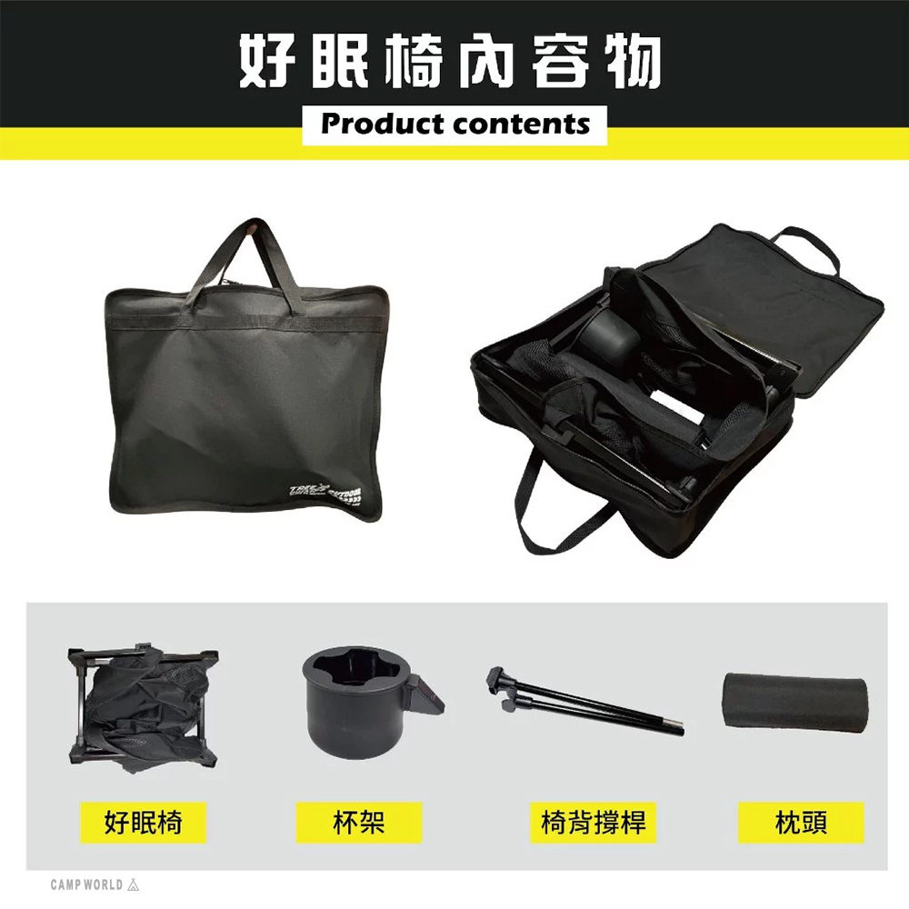 可拆式枕頭、右側置物袋、後方掛物桿,露營小物隨收隨放。