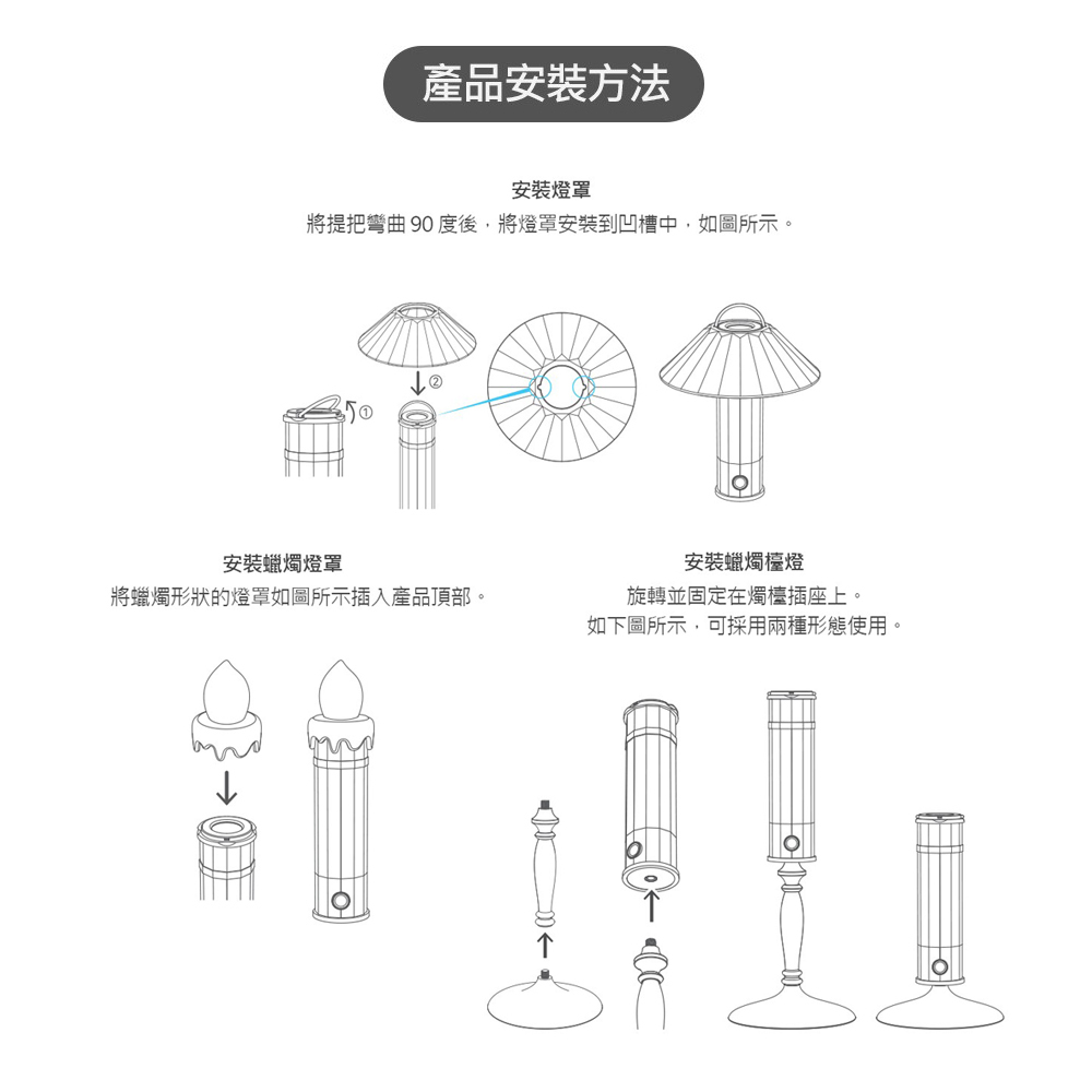 內容物:本體、燈罩、燭檯、蠟燭燈罩、燈罩支架、USB-C充電線、說明書(保證卡)、專用收納盒