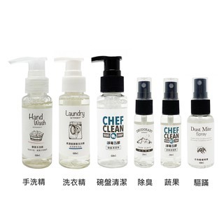 內容物:衣物驅蟎噴霧 40ml,蔬果清潔劑 20ml,消臭洗衣精 60ml,酵素手洗精 60ml,碗盤清潔劑 60ml,除臭噴霧(微風款)20ml
