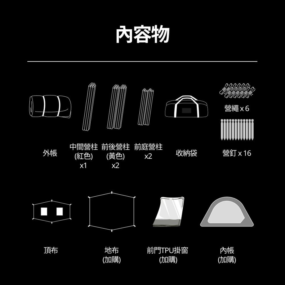 內容物:外帳、頂布、營柱x5、營釘x16、營繩x6、收納袋
