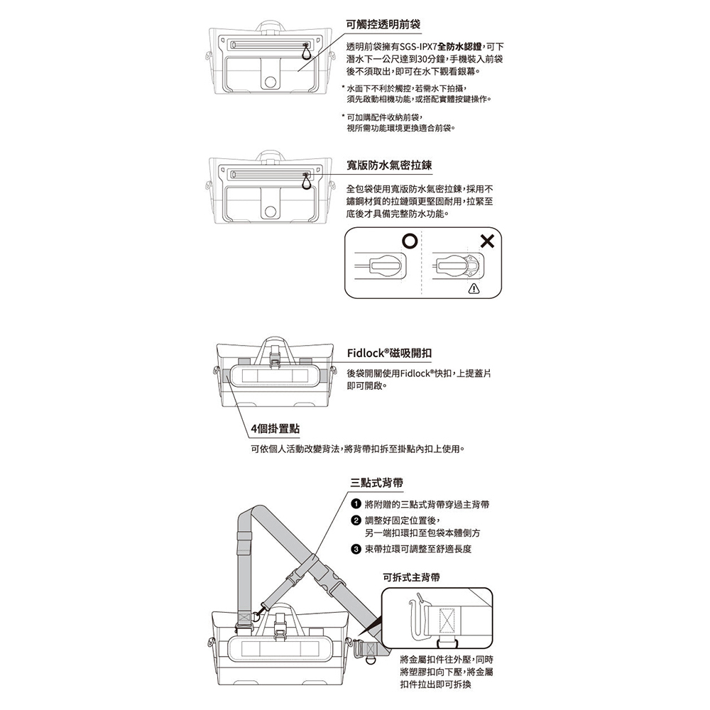 三點式快扣背帶-動態活動時,將包袋穩固於身旁不搖晃或妨礙行動。